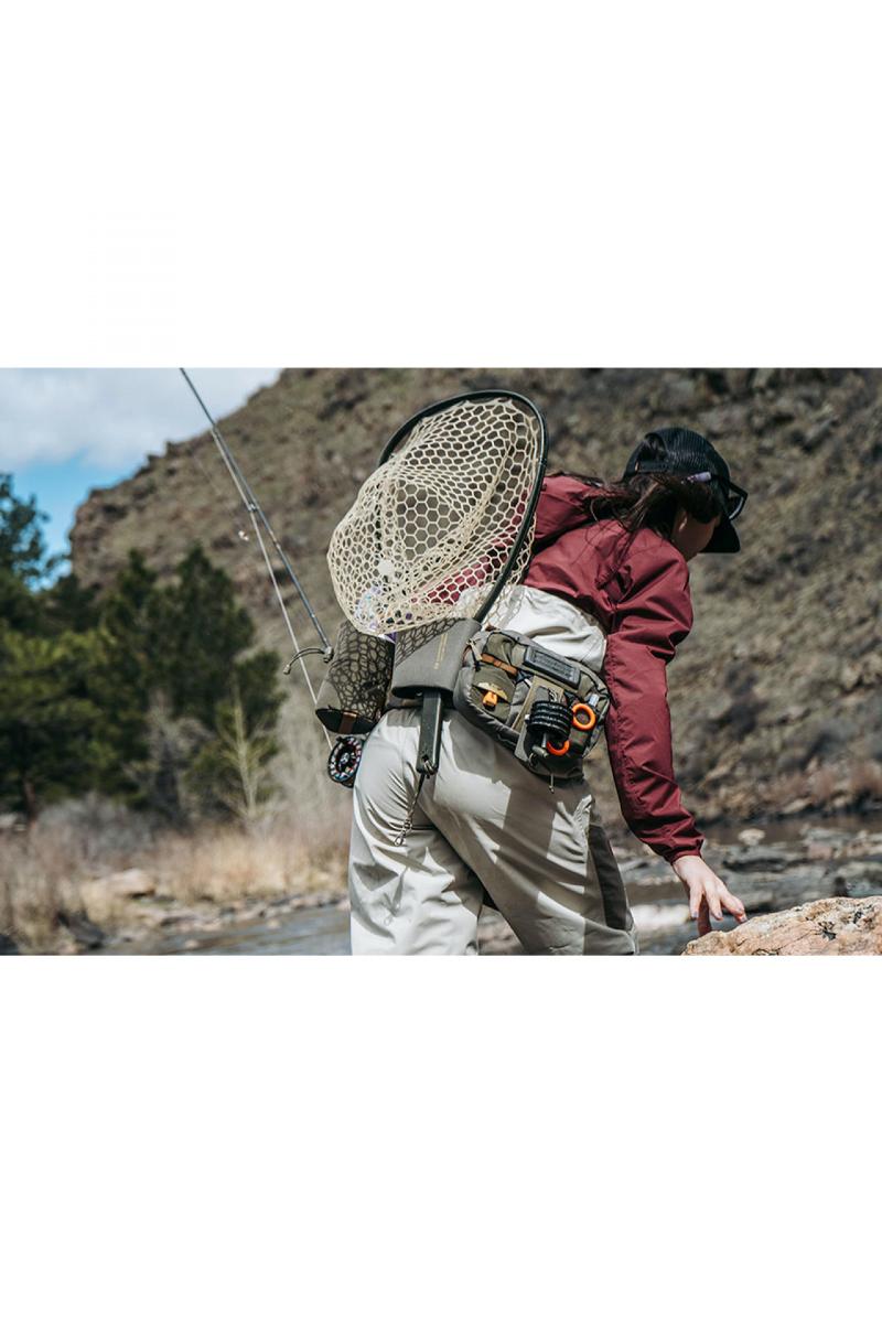 Om Wader Chest pack: Pakningen rommer minst to standard fluebokser sammen med alt nødvendig tilbehør, umiddelbart tilgjengelig når du fisker. Innvendig har den ett hovedrom og en meshlomme med borrelåslukkking. En retraktorstasjon gir festepunkt for klipper hengende på utsiden og to festebånd i overkant gir mulighet til å feste beholdere med ulike typer impregnering. pakningen har to forsterkede festepunkter for krokløsnertang. Fronten har også en liten foamplate for feste av fluer og en modulær festestasjon som tillater integrasjon med diverse beholdere som kan kjøpes separat. I nedre front av pakningen ligger en integrert holder for spissmateriale som kan bæres utenpå pakningen.