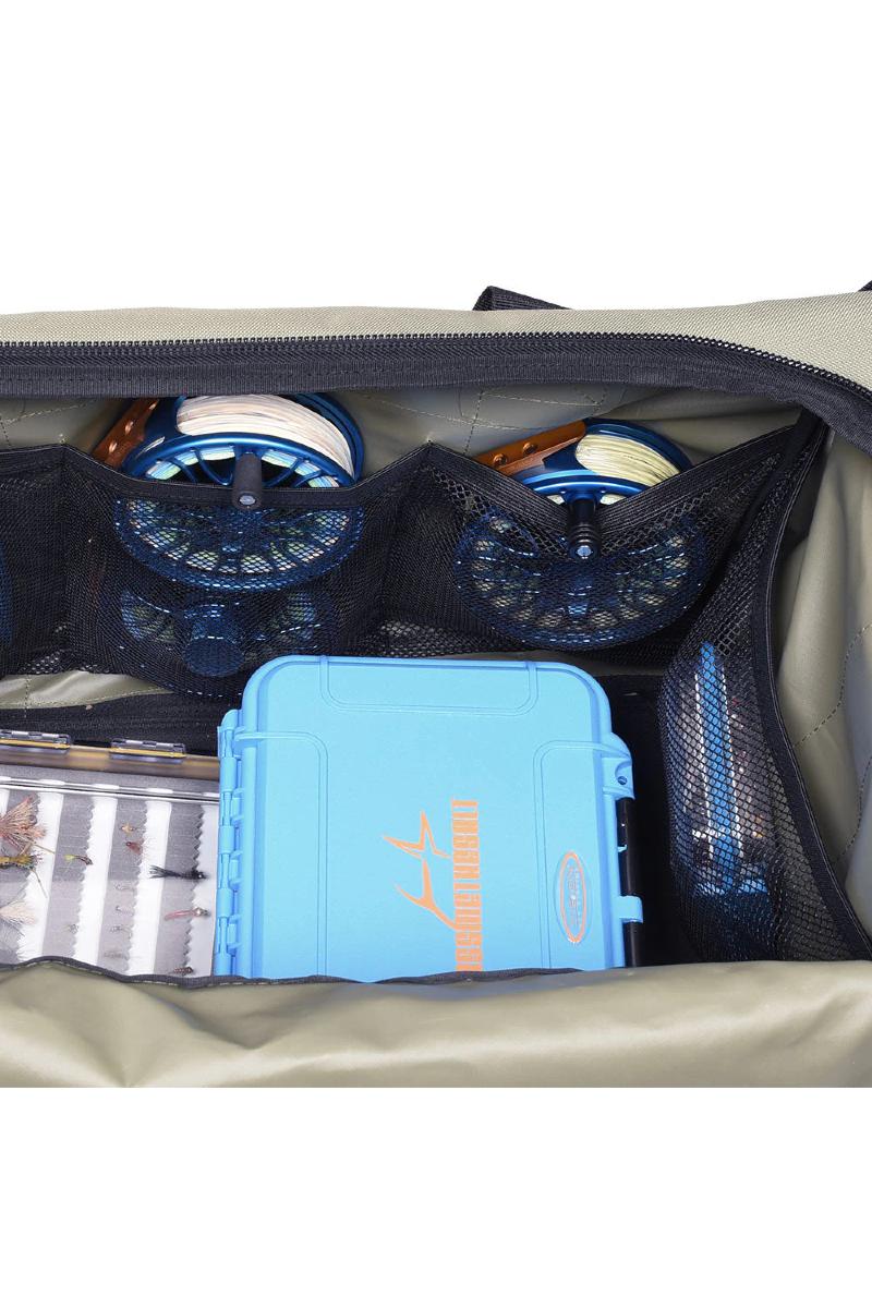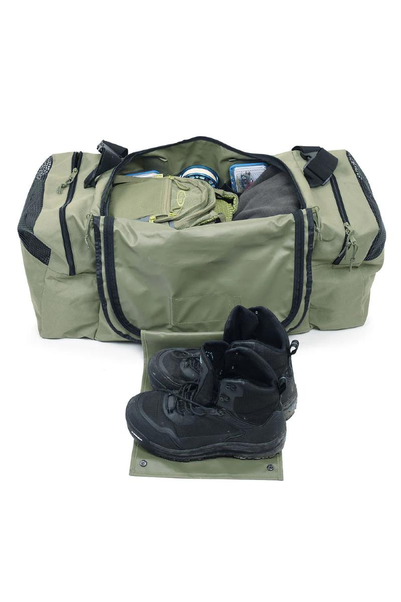 Transport, oppbevaring og ryddighet- denne vesken gjør det enkelt og til en overkommelig pris. All in One- bagen er laget av tøff og slitesterk 600 Denier Oxford polyesterstoff. Den har et stort hovedrom for klær, med en U-formet glidelåsinngang for tørr oppbevaring. Oppbevaringslommer i netting inne i hovedrommet med elastiske festestropper holder utstyret på plass. To sjenerøse enderom med dreneringshull og overdel i mesh holder våte vadere og støvler for tørking. Bagen er også utstyrt med en stor sidelomme for tilbehør.