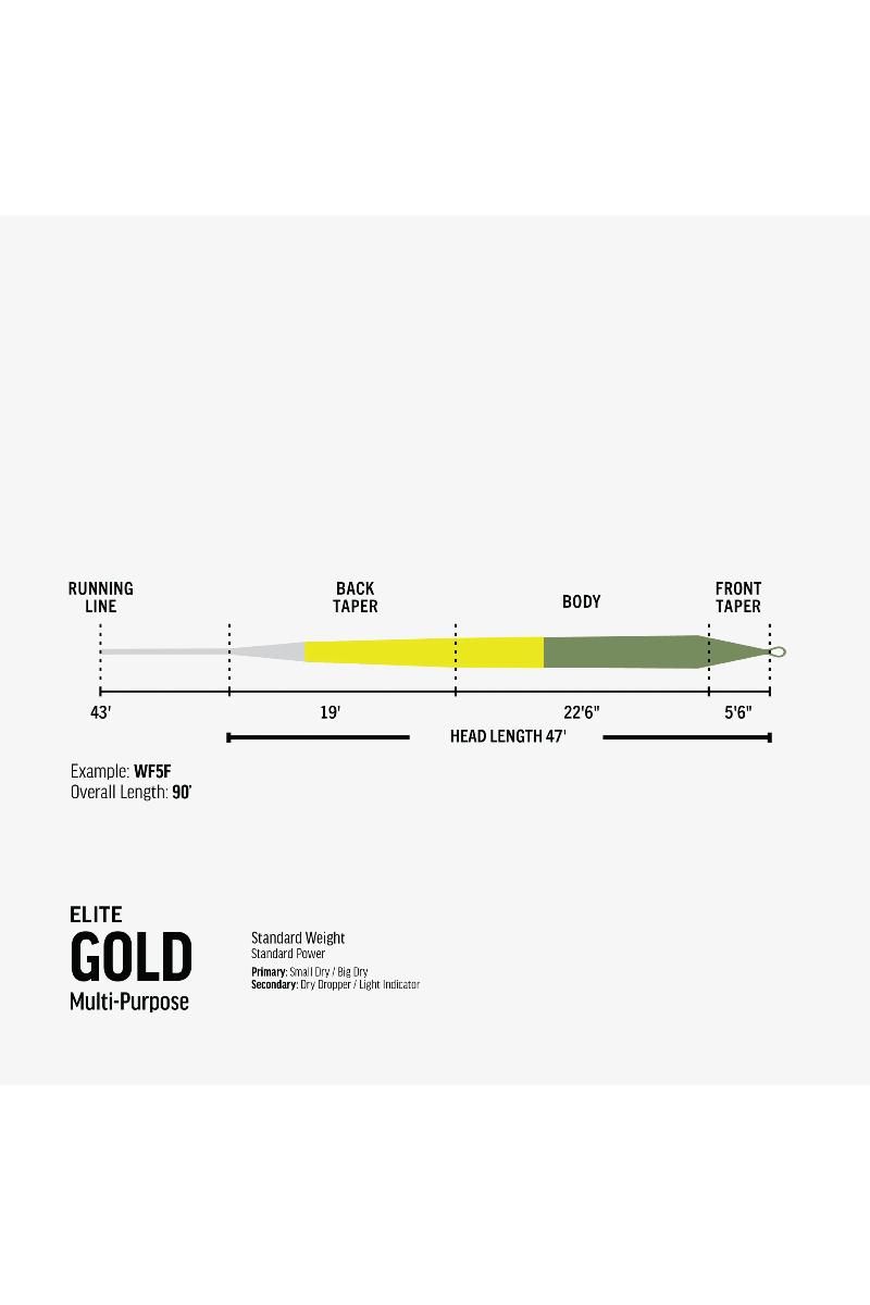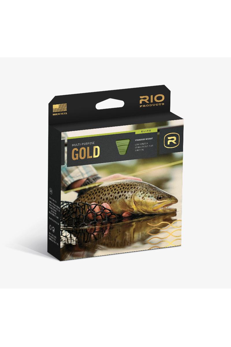 Elite RIO Gold er en WF flyteline men en lang belly/vektdel og en lang baktapering. Bellylengden er over 14 meter. Dette er fluelina for en mer erfaren fluekaster som er i stand til å holde lange linelengder i blindkastene og som kan lene seg mer på teknikk enn på vekta av lina på korte kast.