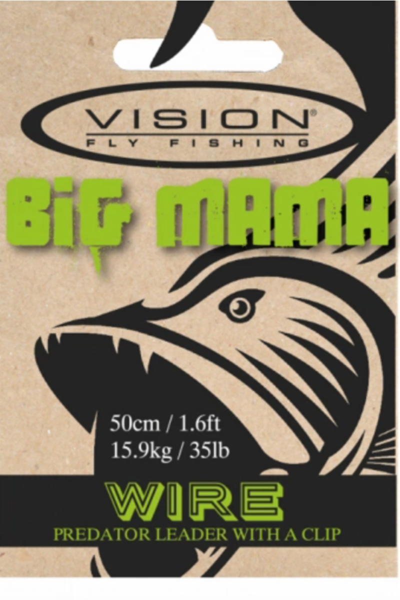Big Mama Wire er et 50 cm langt stykke kraftig wire (35lb) med en skikkelig Mustads Fastach™-klemme på forenden og en stor løkke på bakenden. Det er enkelt å feste denne “spissen” til din egen fortom.