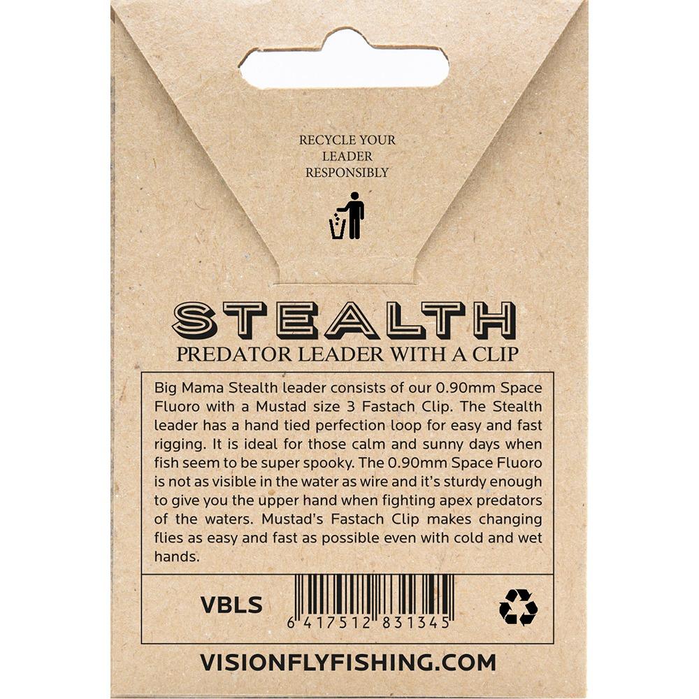 BIG MAMA STEALTH er laget utelukkende av Visions Space fluorocarbon 0,90 mm. Den er ideell for de forholdene når havet er rolig og været er solfylt og fisken ser ut til å være super sky. Den totale lengden på denne fortommen er litt over 2 meter. Den har en løkke på bakenden og en solid Mustads FastachTM klips på forenden.