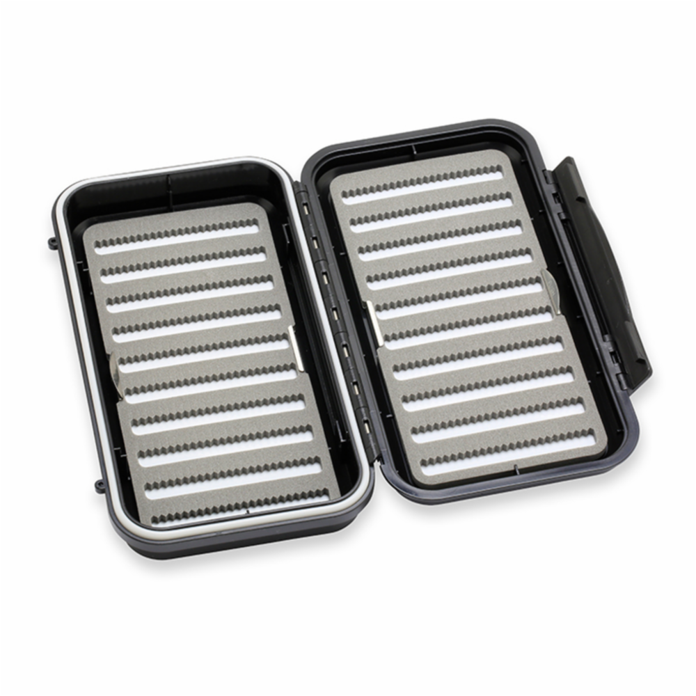 C&F Designs nå legendariske vanntette fluebokser er like tøffe og holdbare på utsiden som de er pene og organiserte på innsiden. Boksen er i str.  Large. Den har to utskiftbare foamplater,  med 10 rader på hver side. Denne inndeling av foamplaten betegnes Midge og anbefales av  C&F for fluer i krokstr. 16 og mindre. Det er spor til 480 fluer, men da står de i overkant tett. Vi vil mene at denne boksen også rommer større krokstørrelser med større avstand mellom hver flue. Foamplaten er laget med såkalt Micro Slit Foam. Den holder et bredt spekter av kroker, skånsomt men sikkert. Hakk hjelper deg med å finne sporene, noe som gjør flueorganiseringen enkel. Det er bare å sette krokbøyen inn i spalten.  Foamplatene kan lett  klipses ut og erstattes av en annen foamplate.  Boksen er vanntett og på alle måter en sikker oppbevaring av fluene som vil vare i årevis.