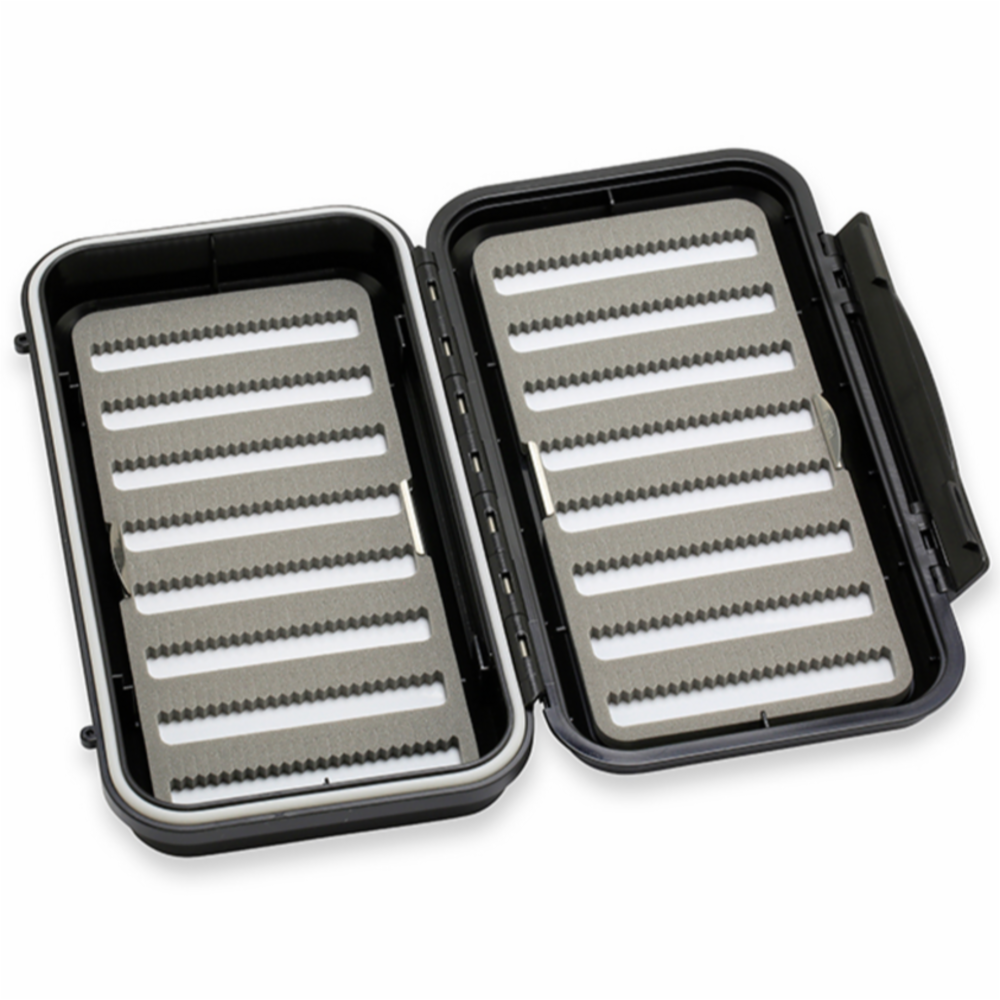 C&F Designs nå legendariske vanntette fluebokser er like tøffe og holdbare på utsiden som de er pene og organiserte på innsiden. Boksen er i str. Large. Den har to utskiftbare foamplater, med 8 rader på hver side. Denne inndeling av foamplaten betegnes Standard og anbefales av C&F for fluer i krokstr. 12 til 18. Det er spor til 384 fluer, men da står de i overkant tett. Foamplaten er laget med såkalt Micro Slit Foam. Den holder kroker skånsomt men sikkert. Hakk hjelper deg med å finne sporene, noe som gjør flueorganiseringen enkel. Det er bare å sette krokbøyen inn i spalten. Foamplatene kan lett klipses ut og erstattes av en andre foamplater. Boksen er vanntett og på alle måter en sikker oppbevaring av fluene og vil vare i årevis.