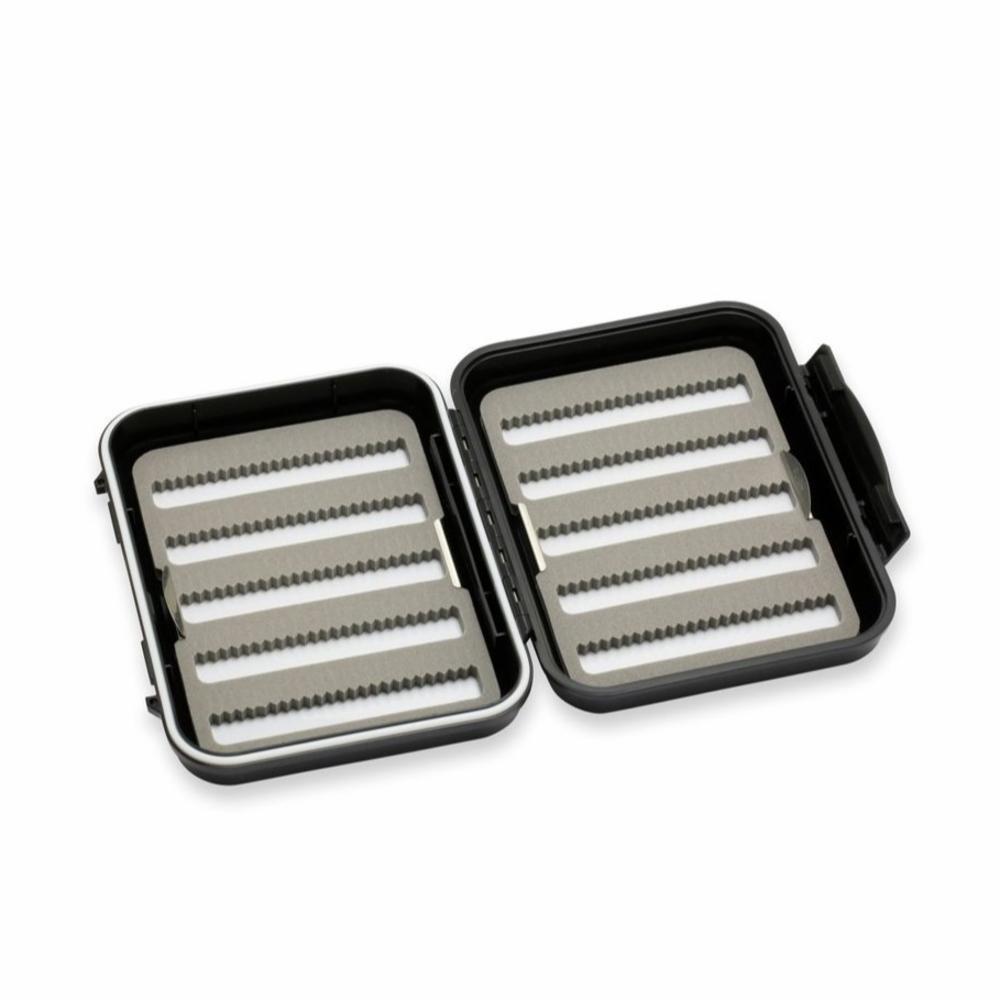 C&F Designs nå legendariske vanntette fluebokser er like tøffe og holdbare på utsiden som de er pene og organiserte på innsiden. Boksen er i str. Small. Den har to utskiftbare foamplater, med 5 rader på hver side. Denne inndeling av foamplaten betegnes Standard og anbefales av C&F for fluer i krokstr. 12 til 18. Det er spor til 240 fluer, men da står de i overkant tett. Foamplaten er laget med såkalt Micro Slit Foam. Den holder kroker skånsomt men sikkert. Hakk hjelper deg med å finne sporene, noe som gjør flueorganiseringen enkel. Det er bare å sette krokbøyen inn i spalten. Foamplatene kan lett klipses ut og erstattes av en andre foamplater. Boksen er vanntett og på alle måter en sikker oppbevaring av fluene og vil vare i årevis.