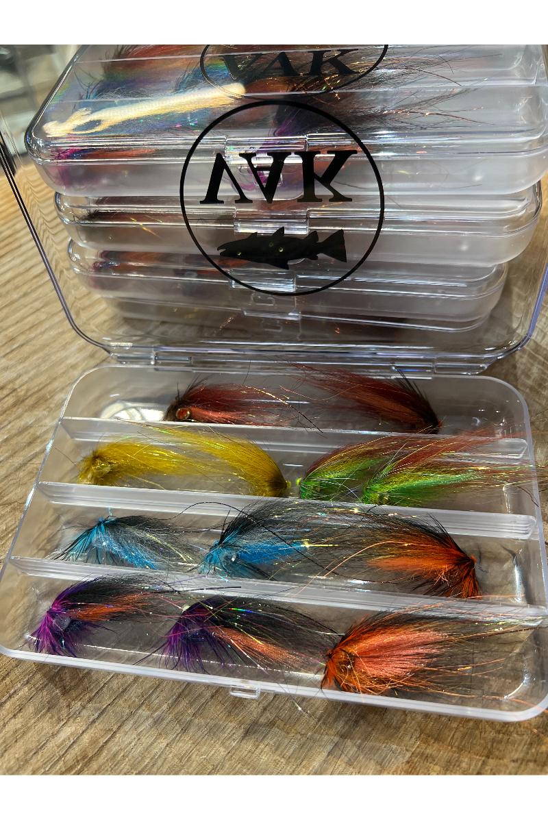 Dette er virkelige fiskefangere bundet med de beste materialer. Settet består av 2 stk varianter av Battahkorva, Banan, Black/Orange og Green Highlander og Sillen. Lengden på fluene er ca 7 cm. Det følger med plastslange for løsthengende krok.