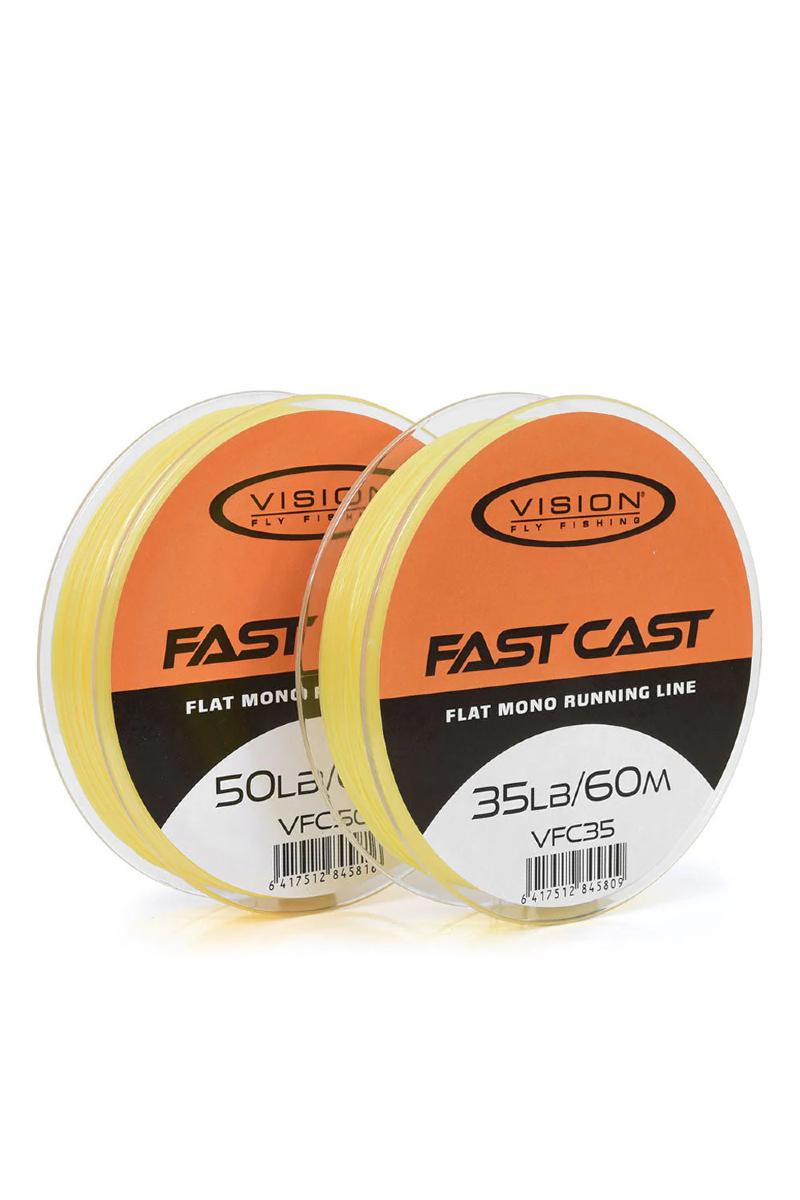 Fast Cast er Visions flate mono skyteline. Glatt, passe myk med liten og friksjonsfri motstand gjennom vannet og ut av ringene. Den har veldig lav strekk som gir deg den ultimate følelsen i fisket ditt, og den har veldig lite minne. Takket være den tynne diameteren tar den ikke så mye plass på snella som tradisjonelle skyteliner. Tilgjengelig i 35lb og 50lb, 60 meter per spole. fargen er gul for god kontrastering, også i dårlige lysforhold.