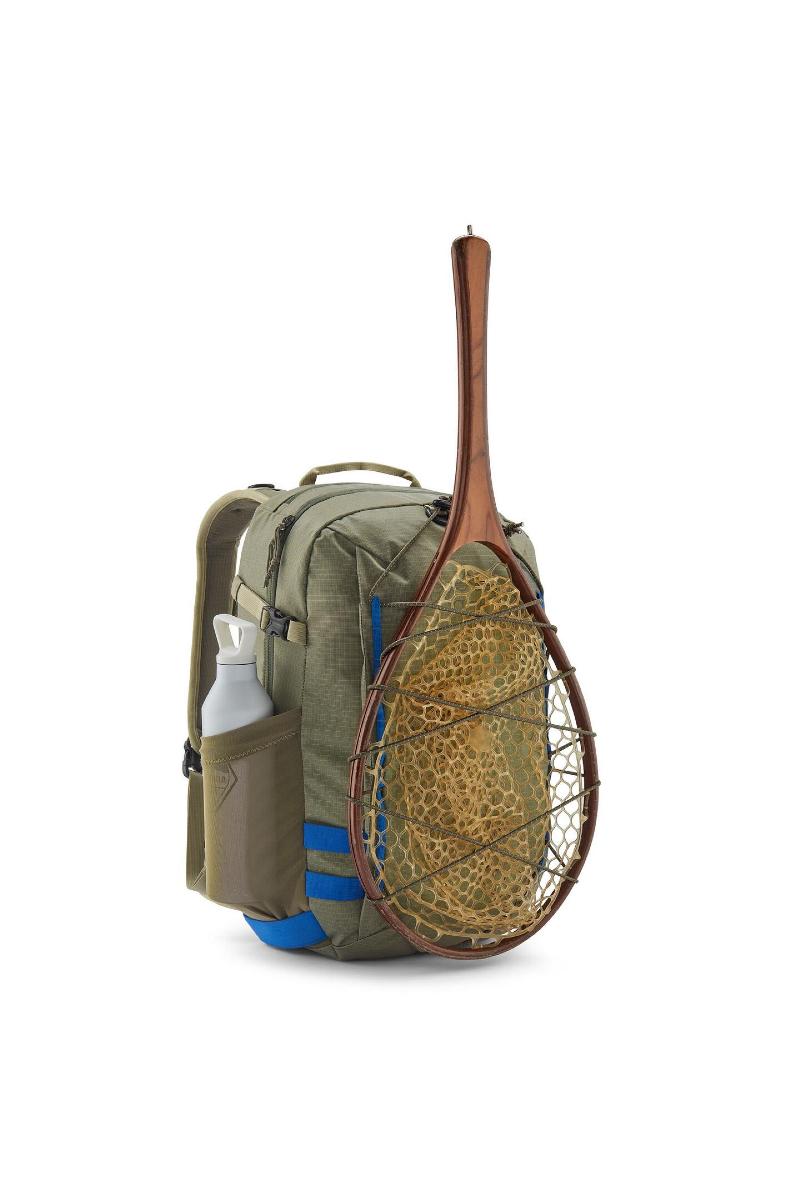 - Sekken gir flere alternativer for å bære håven: en venstre/høyre håvholder er integrert i bakpanelet; en sideløkke gir en rask håvppbevaring; og en D-ring på baksiden kan også holde en håv