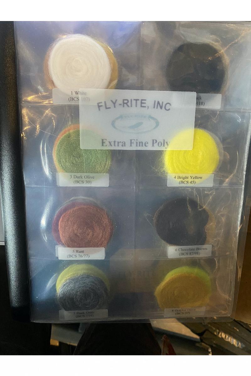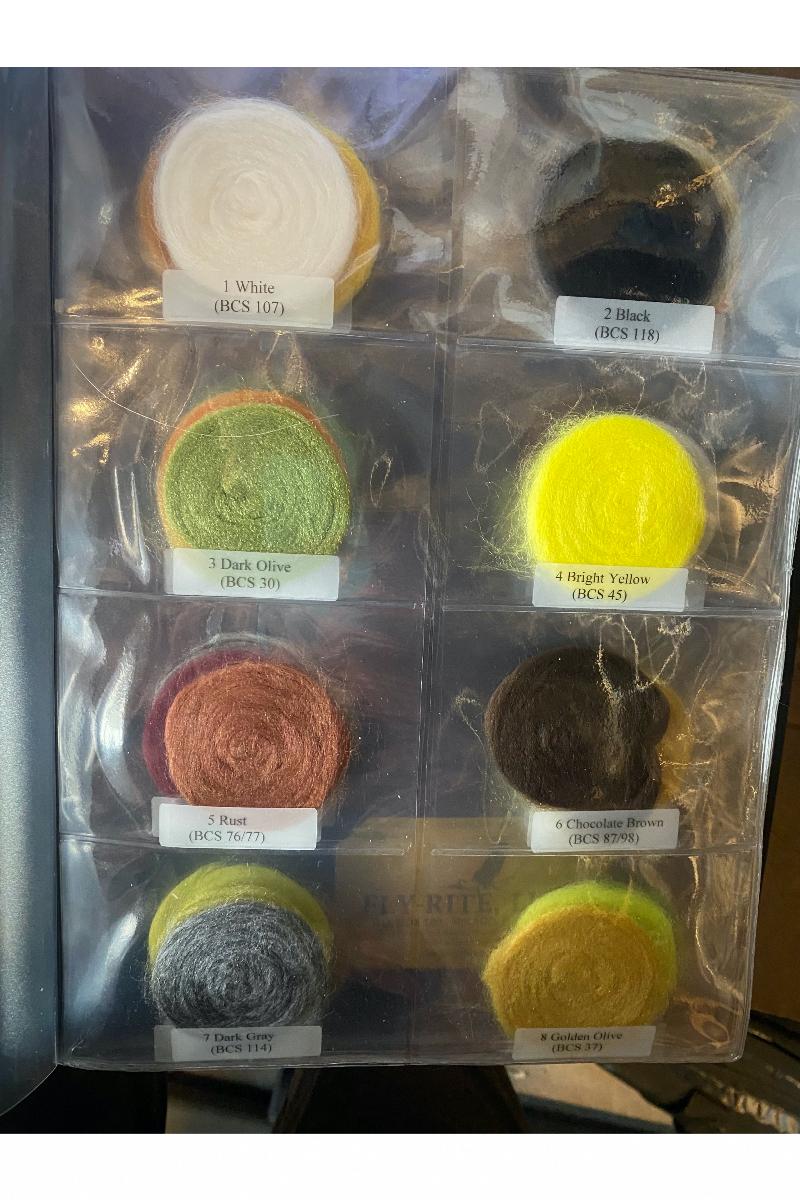 Alle 46 farger av FLY-RITE-dubbing i en luksuriøs, gjennomsiktig mappe.