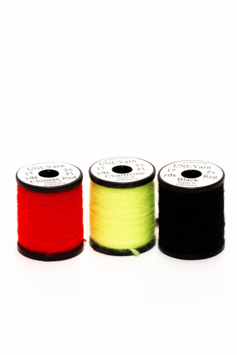 Uni-Yarn er et 2-trådet, tvistet fluebindingsgarn av akryl, til bruk i kropper. Farge Chinese Red er perfekt farge og stofflighet for kropper på røde Frances fluer.