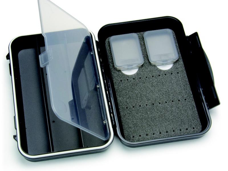 Medium størrelse tubeflueboks laget på forespørsler fra europeiske laksefiskere. Boksen har tre avlange rom for tubefluer på den ene siden, som lukkes med en stor midtplate som holder fluene på plass. Den andre siden har foamplate med slisser for plassering av tubekroker og to separate rom for styreslangevarianter og annet tilbehør. Boksen er vanntett og har en solid lukkemekanisme.